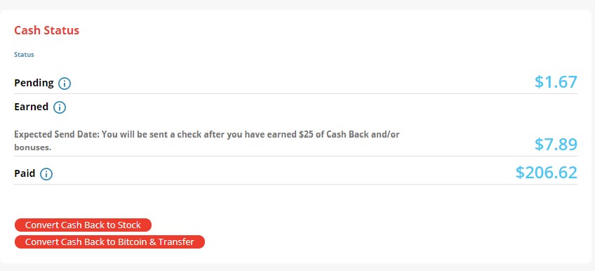 Earned Cash Back will be transferred as Bitcoin upon request.